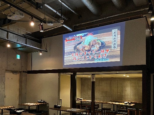 各店舗内のモニターやプロジェクターを使用し、液体塩こうじの商品特徴や各店ごとに撮り下ろした「究極のから揚げ」のプロモーションムービーを店内で放映します。店内で放映することで、「究極のから揚げ」の認知を高め、各店舗の販売増につなげます。