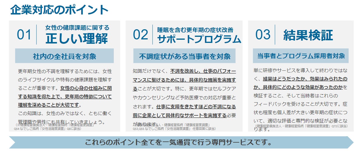知識を得るだけではなく、不調を改善して仕事のパフォーマンスにつなげる具体的な施策を実施することが⼤切です。特に、更年期は、セルフケアやカウンセリングなど予防医療の分野での対応が極めて重要とされています。仕事に⽀障をきたすほどの不調になる前に企業として具体的なサポートを実施する必要があります。
