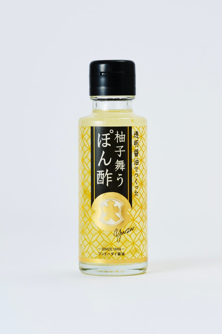 透明醤油でつくった、柚子が主役のぽん酢で、柚子の色が鮮やかです。透明醤油を使うことで、まるで柚子が舞っているかのような黄金色のぽん酢ができました。「黒い」ぽん酢の常識をくつがえす見た目も美しいぽん酢。鍋物・焼き魚はもちろんカルパッチョや冷製パスタなど素材の色を活かしたいお料理におすすめです。
