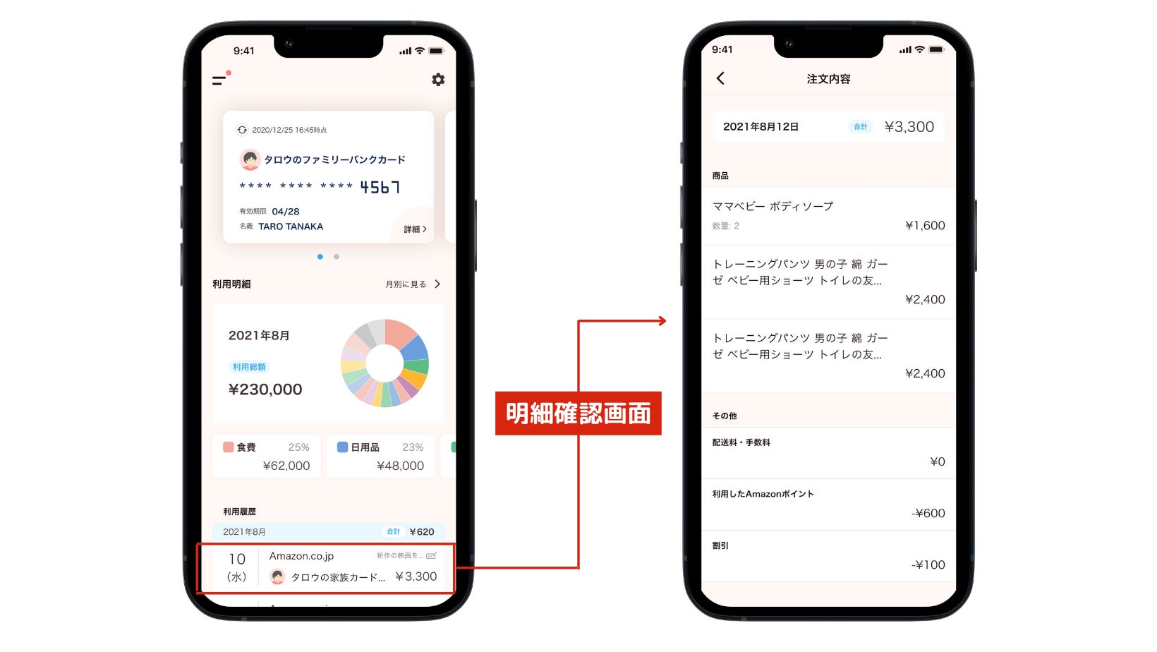 今回の機能追加により、Amazonアカウントとの連携設定をするだけで、Amazonの購入内容の詳細が自動でファミリーバンクアプリに反映され、1タップで確認できるようになります。