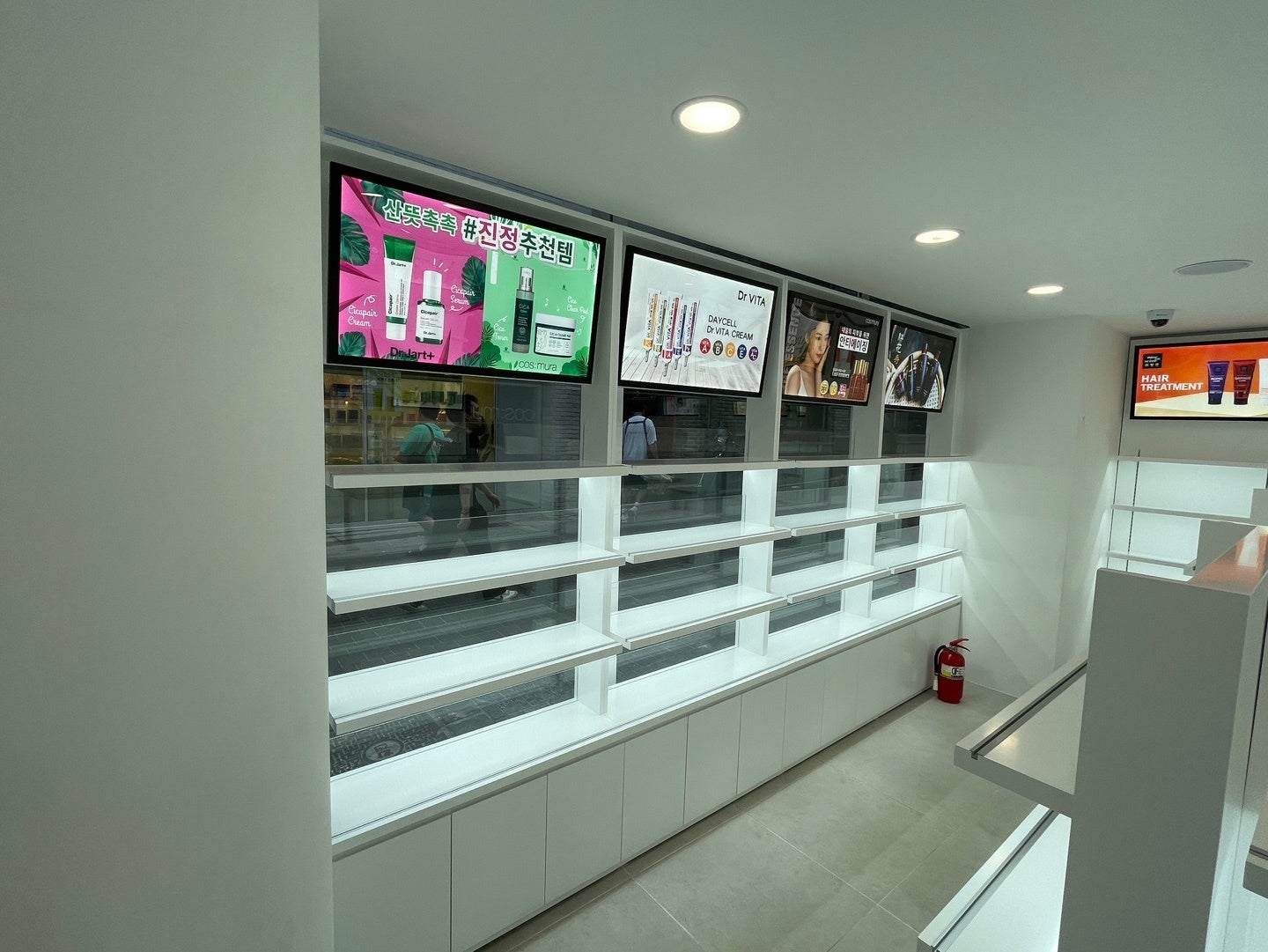 また、店内の雰囲気はブラックとピンクのトーン&マナーカラーを用いており、ブラックは高級感を演出するために他のポイントカラーとの組み合わせに最適です。ピンクは女性を象徴するカラーで、ロマンチックで愛らしい雰囲気を醸し出しています。マスクシートなどの人気商品を前面に陳列し、顧客の購買動線を分析して独自の陳列パターンを実現しています。