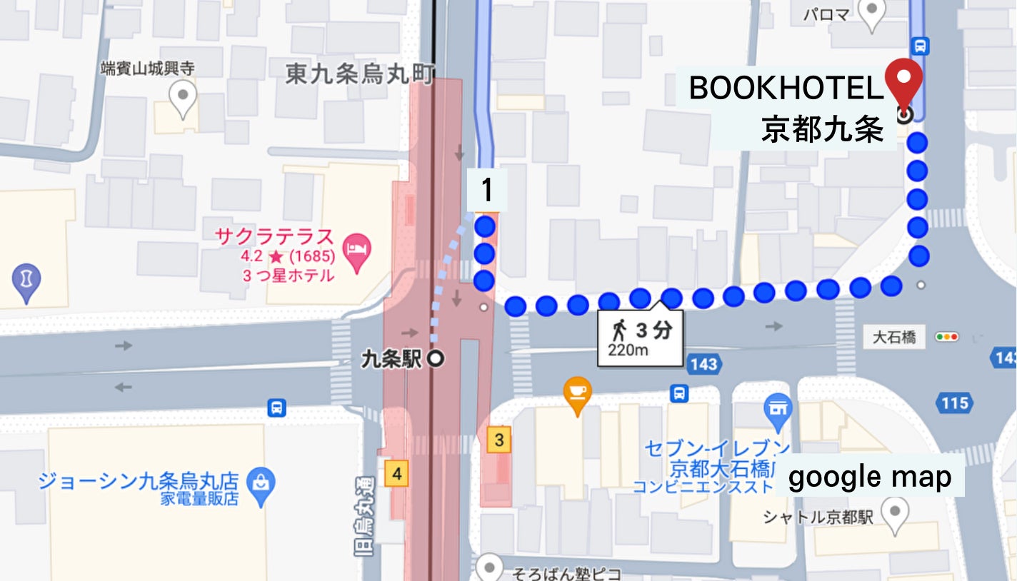 当ホテルは、地下鉄烏丸線九条駅から徒歩3分、JR京都駅から徒歩7分と、旅行や出張で京都を訪れる方が利用しやすい好立地となっています。また、京都駅から当ホテルまでは、平坦な道が続いており、大きな荷物を持って移動するインバウンドの宿泊者にとっても、嬉しい立地にございます。