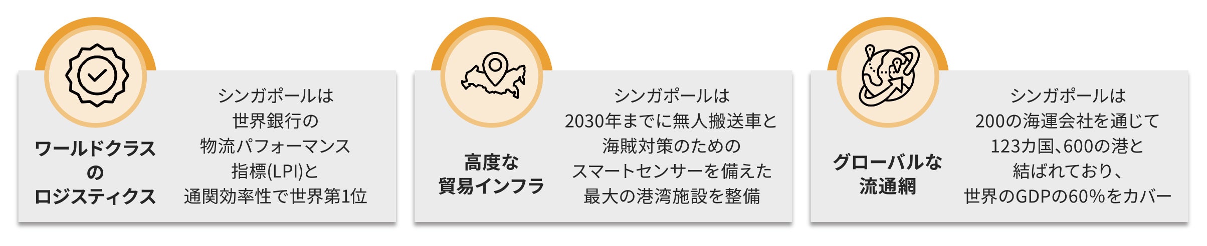 シンガポールは、既に今後「空港と港湾の能力を大幅に化する」ことを表明しており(https://www.edb.gov.sg/ja/newsroom/news-library/japan-singapore-global-logistics-supply-chains.html)、この点についてEDBのダミアン・チャン企画・政策担当副次官は、7月に開催された「SCM-Jobs Transformation Map Study」イベントにおいて、「世界との接続性を強化し、長年にわたる投資によってデジタルとデータのエコシステムを成長させてきたことにより、グローバル企業にとって信頼できるSCの拠点としての強固な基盤が築かれた。これにより、SCM能力を持つ地元企業に新たな門戸が開かれ、シンガポール以外の新興市場へのアクセスが容易になる」と述べている。