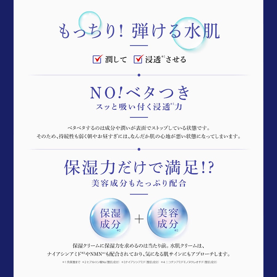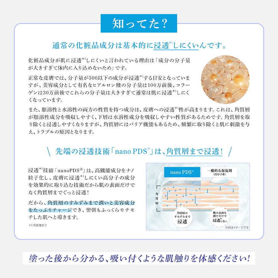 潤いに加え年齢悩みにもアプローチ、話題の成分NMN(ニコチンアミドモノヌクレオチド)を代表とした41種の美容成分と、ナノレベルで美容成分を届ける先端浸透*技術『nanoPDS🄬』でこれまで以上の肌へと導きます。