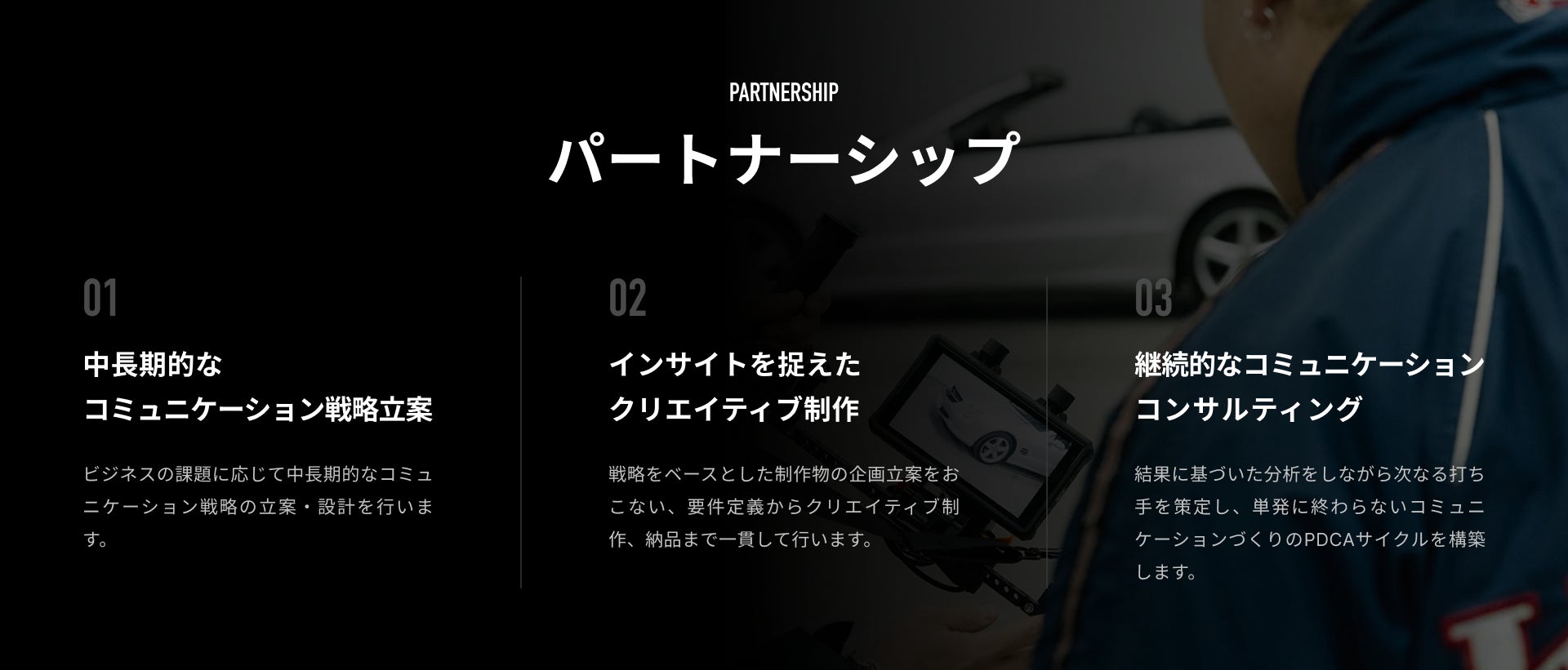 クルマ文化への知見と独自のコミュニティを活かし、ブランド構築、制作、SNS運用までをワンストップでサポート。対象クライアント様をお持ちの広告代理店様との協業も見据えた柔軟なプラン設計をご用意。