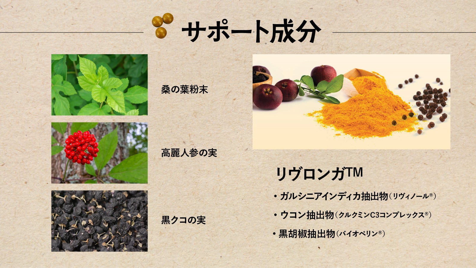 日本では珍しい秋ウコン根茎を使った素材「リヴロンガ™」。ガルシニアインディカ抽出物「リヴィノール®」、ウコン抽出物の「クルクミンC3コンプレックス®」、黒胡椒抽出物の「バイオペリン®」の3種類を配合。