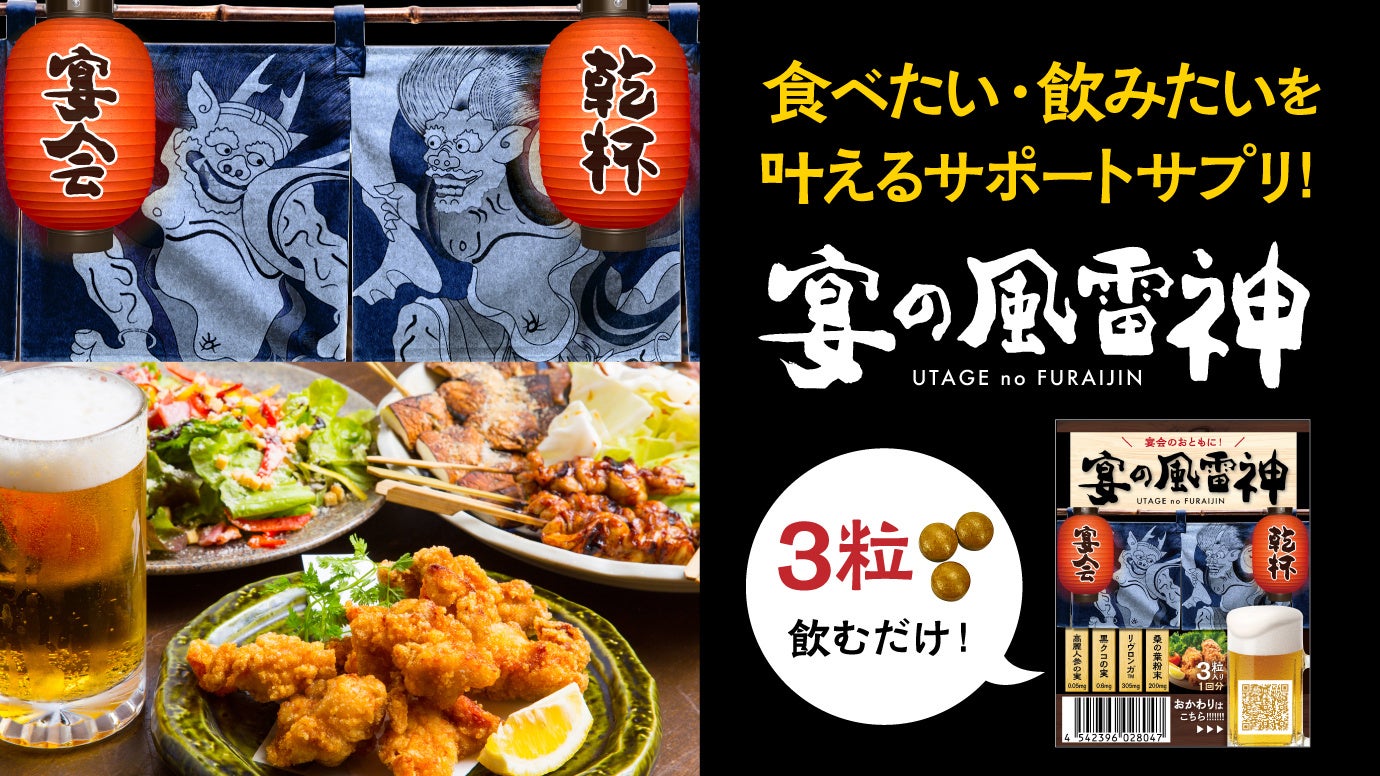 【開始 約1時間で目標額達成!!】宴のおともに。栄養サポートサプリメント「宴の風雷神(うたげのふうらいじん)」、Makuakeにて独占予約販売を開始!