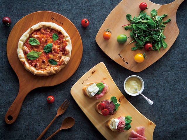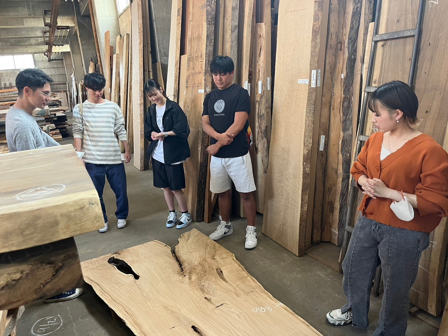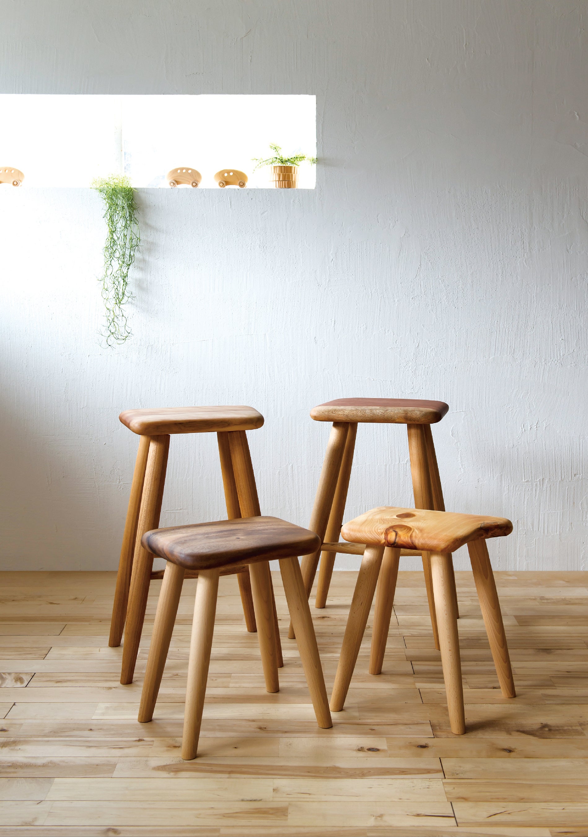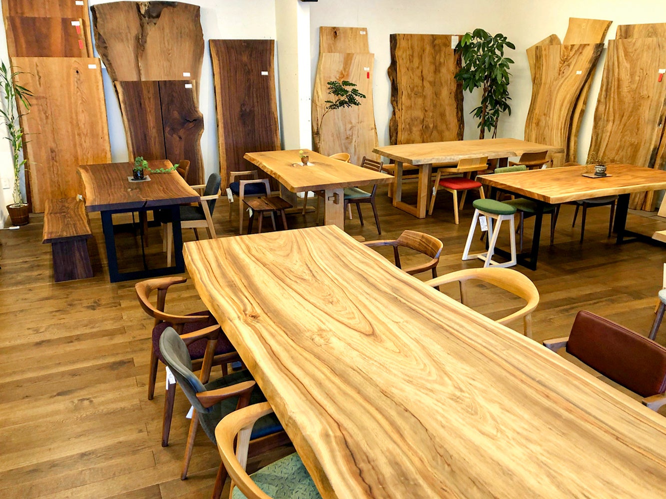 同社では、無垢材の持つ個性を、自然が作り出す「Nature Design」として大切にしている。二股になっていたり、三日月だったり、穴が開いていたり、通常では使いづらいとされる個性的な無垢材も多く保有し、それらを活かす場・商品を常に考え多くの方々に提案している。
