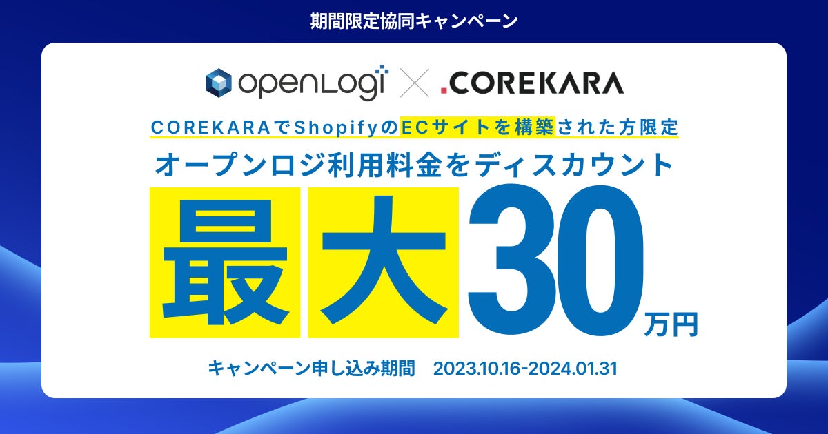 この度、オープンロジは、制作からコンサルティング・Webマーケティングを行う株式会社これから(本社:東京都新宿区、代表取締役 今泉雄介、以下COREKARA)で新規ECをShopifyで構築した事業者、または既存ECをShopifyでリプレイスした事業者で、初めてオープンロジを利用するユーザーを対象に「COREKARAでShopifyを構築した方限定!オープンロジの利用料金から最大30万円のディスカウントキャンペーン」を実施しております。