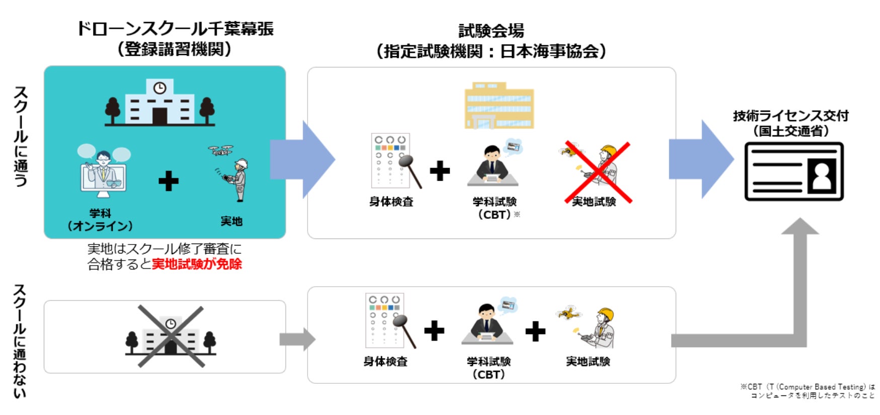 自動車免許の場合は自動車教習所に通い、卒業検定までを教習所で実施し、試験センターにて学科試験に臨む形かと思います。無人航空機(ドローン)についても同様の流れとなります。