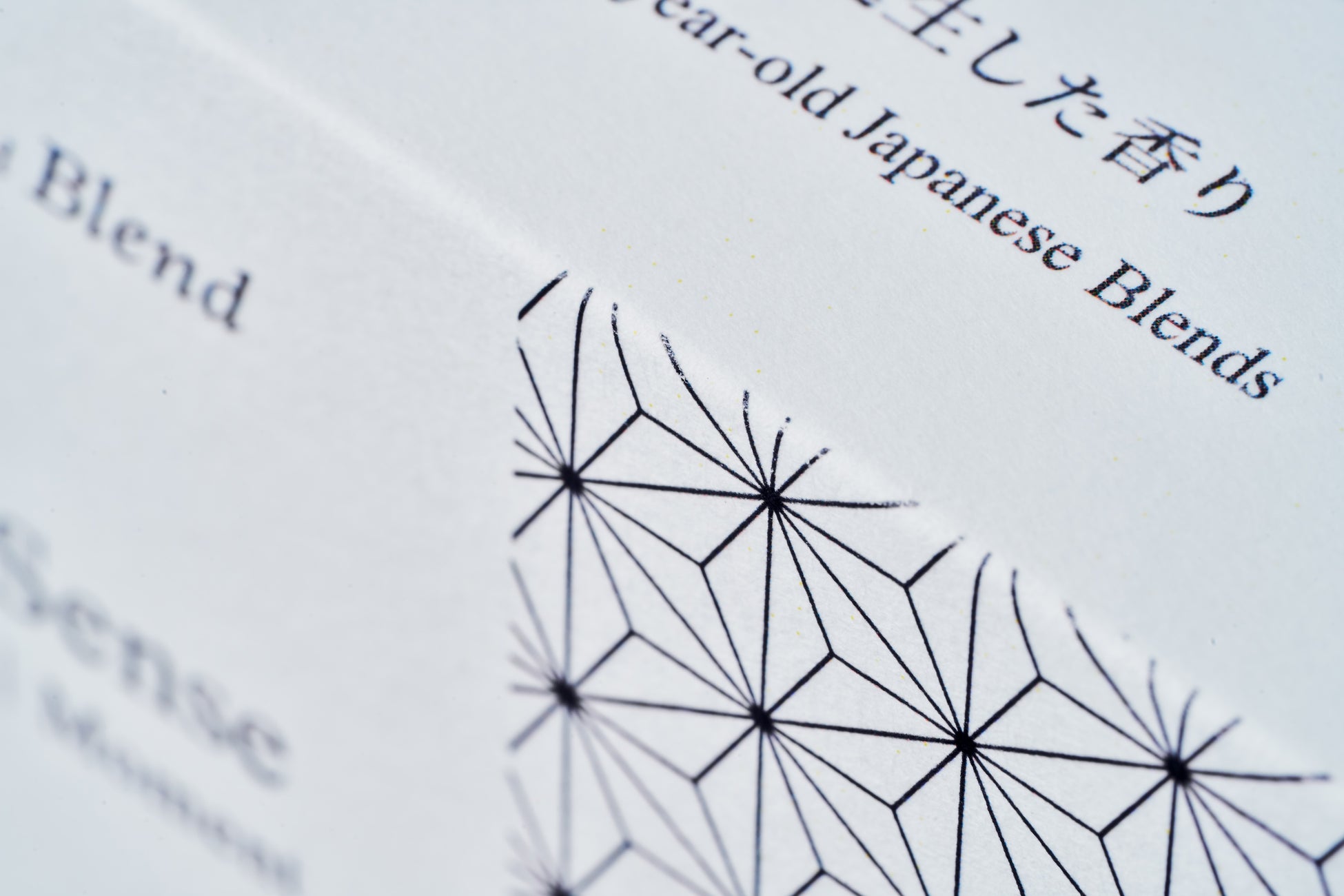 パッケージデザインには古代紋様の麻の葉を起用。この紋様にはBridge and Blend「Six in Sense」のコーン型お香をモチーフにした三角形と、この度リリースしたスティック型お香の直線が隠れており、俯瞰的に眺めると6つの香りを意図する六角形が浮き上がって見えます。