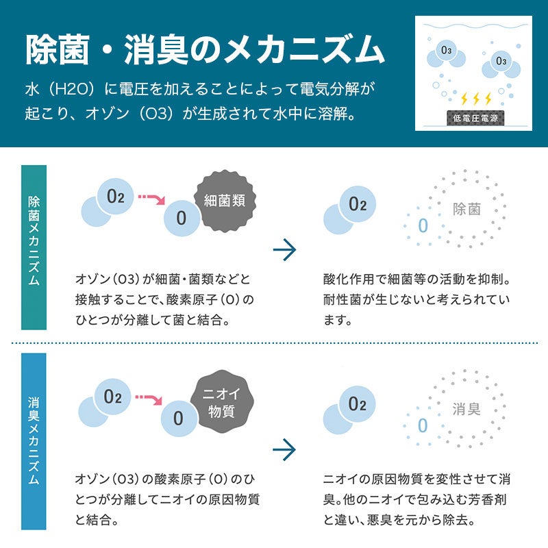 オゾン水は、ニオイの原因菌を根本から分解・除菌し、本当の意味での消臭を実現します。