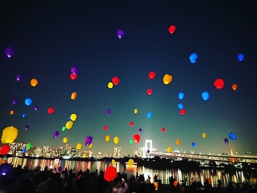 水と緑の溢れる臨港パークの夜空にカラフルランタンが彩るイベントです。皆様がランタンに書いた思い思いの言葉が天高く舞い上がり、満点の星空、夜空に色とりどりの灯りが灯ります。