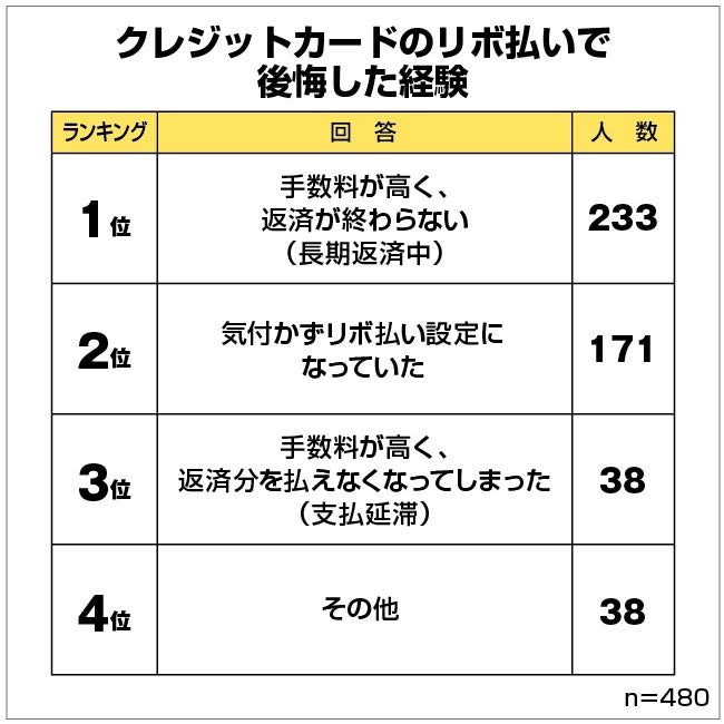 そこで、「クレカの<リボ払い>で後悔した経験がある人へのアンケート(自社調べ)」で意見を募集しました。