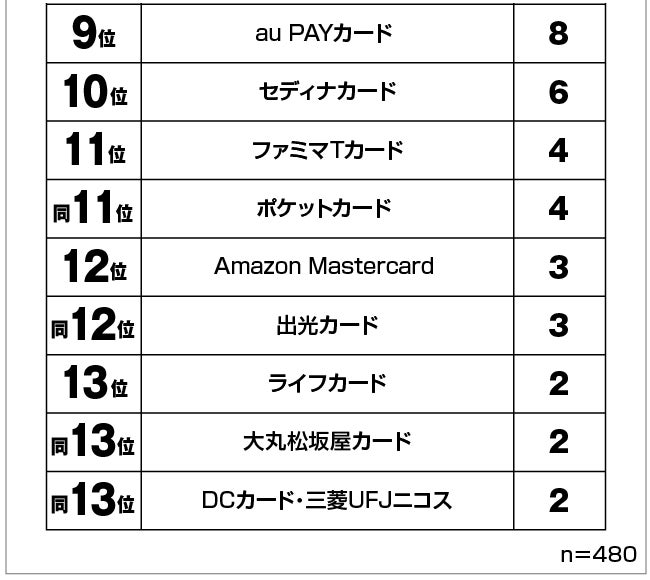 群を抜いて多かったのが、楽天カードです。楽天市場だけでなく街のお店でのお買い物でも楽天スーパーポイントが貯まるので、その使い勝手の良さから利用している人も多いのではないでしょうか。