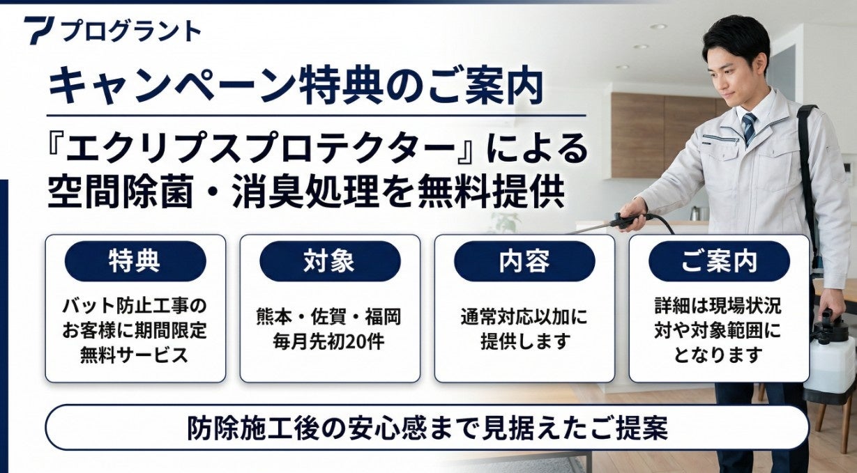 プログラントでは、コウモリ防除施工をご依頼いただいたお客様を対象に、独自技術・次世代光触媒「エクリプスプロテクター」による空間衛生サービスを期間限定でご案内しています。