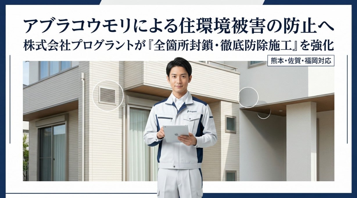 株式会社プログラント(本社:熊本県熊本市、代表取締役:藤井靖光)は、アブラコウモリ(いわゆる家コウモリ)による糞害・悪臭・住環境悪化・再侵入被害の防止に向け、熊本県・佐賀県・福岡県の戸建て住宅を対象とした「全箇所封鎖・徹底防除施工」を強化いたします。