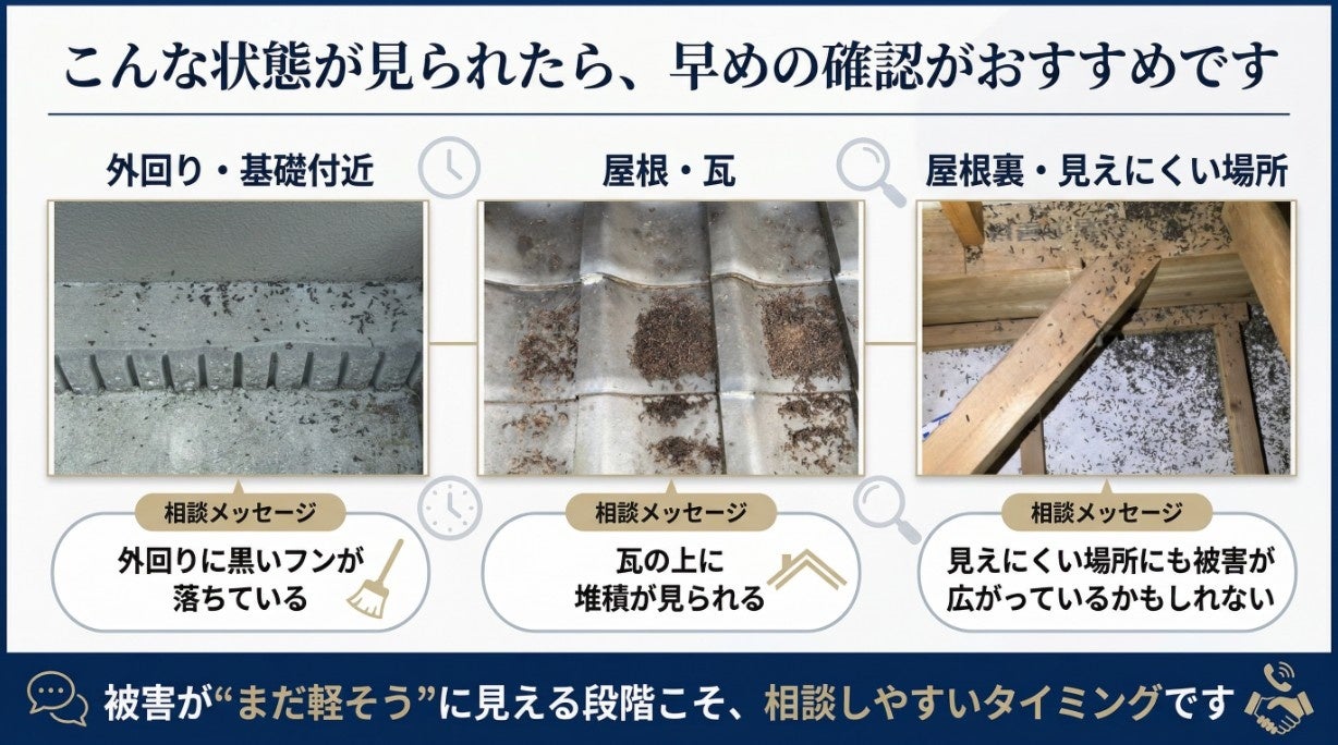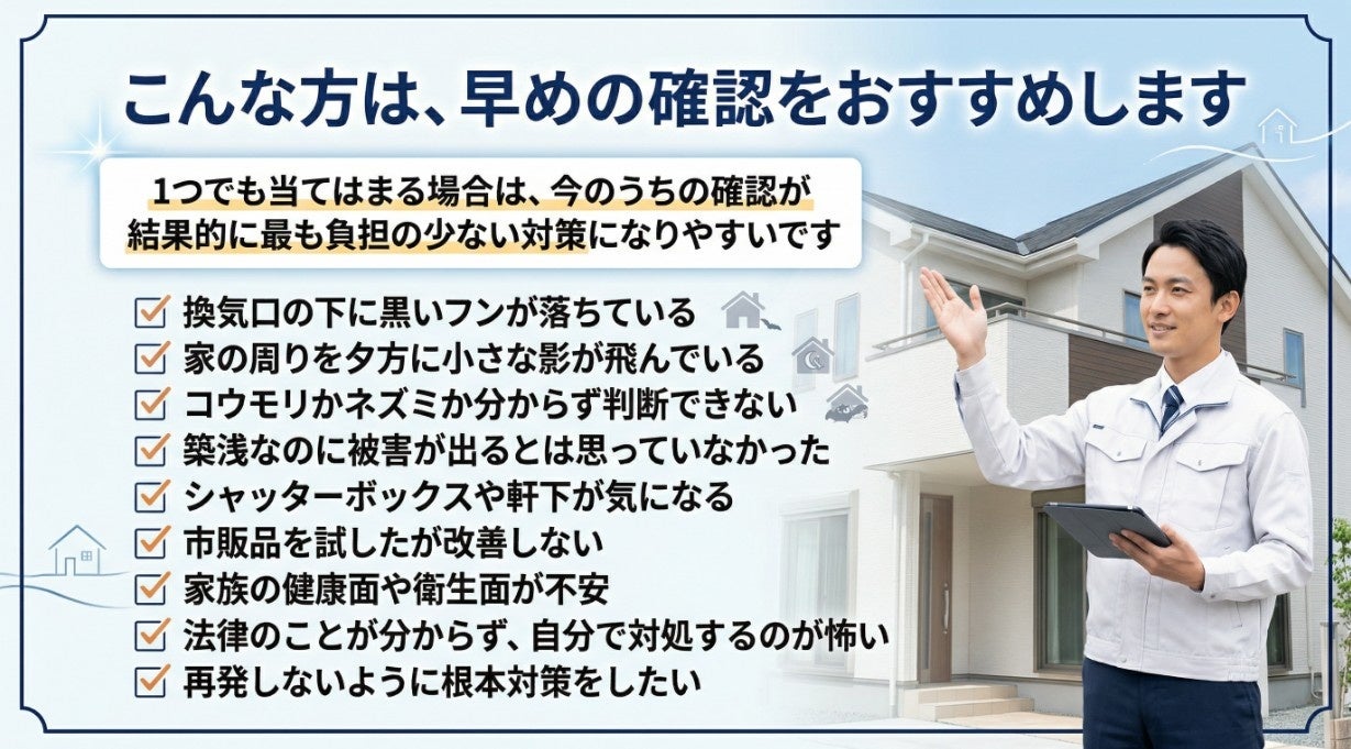 「換気口の下に黒いフンが落ちている」「夕方になると家の周りを小さな影が飛ぶ」「壁や軒先から出入りしている気がする」など、少しでも気になる症状があれば、早めの確認が安心につながります。