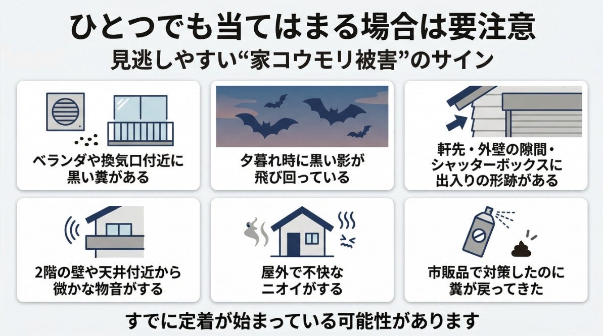 このような症状がある場合、すでにコウモリが定着し始めている可能性があります。
