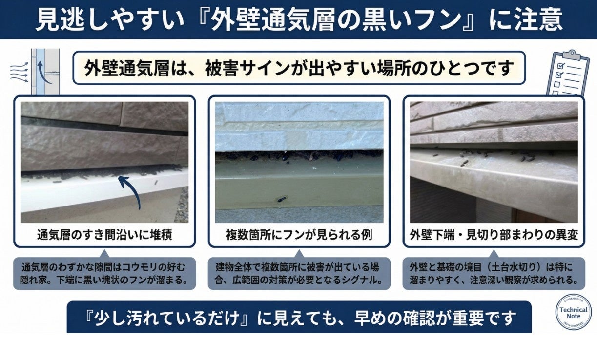 このため、換気部や吸気経路の近くに糞が堆積すると、単なる外壁の汚れにとどまらず、臭気・粉じん・ダニ等による住環境悪化につながるおそれがあります。海外向け公衆衛生情報でも、コウモリや鳥の糞に関連する真菌を含む粉じんの吸入リスクが紹介されています。