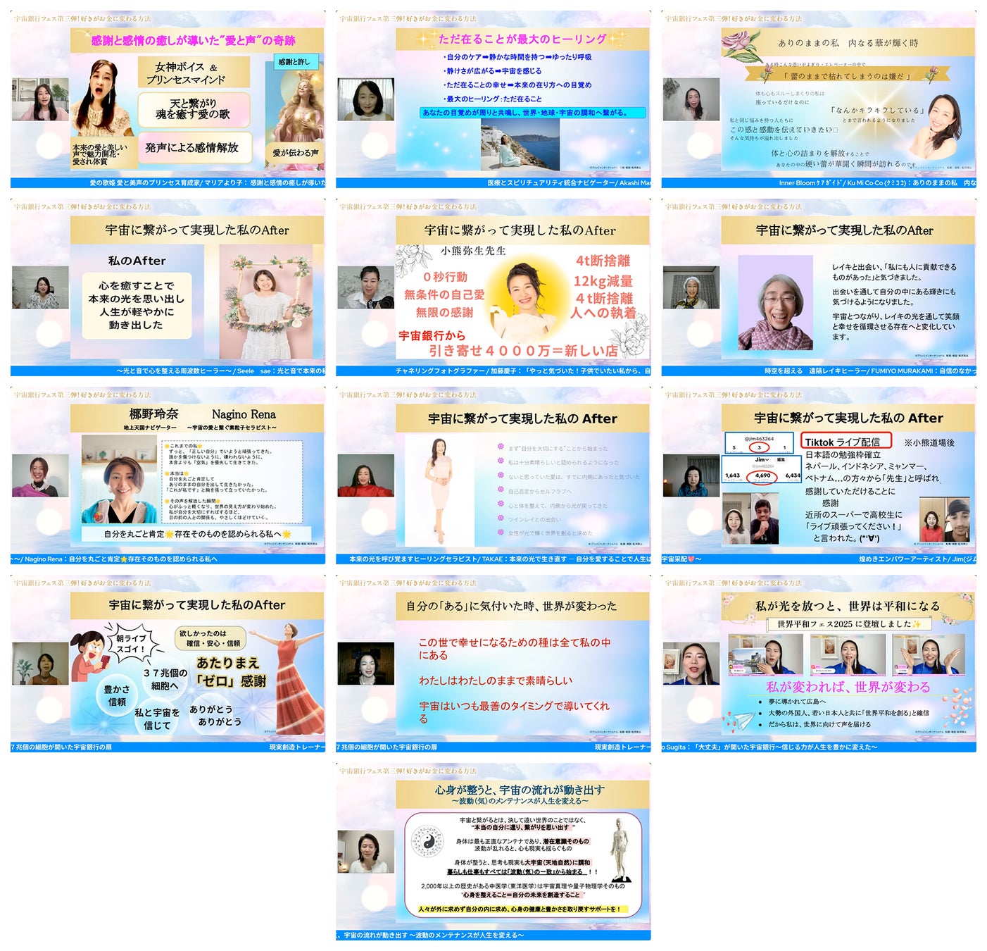 ただ在ることが最大のヒーリングと説く医師、「私なんて」を卒業した医療従事者、TikTokライバーとして活動する元教師、毎日の感謝で現実が変わった薬剤師、心身が整うと人生が変わると伝える鍼灸師など、13名の女性が体験を話しました。