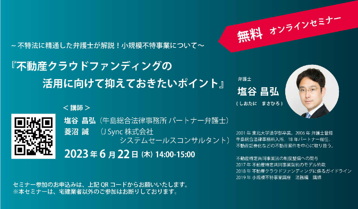 今回のセミナーでは、不動産クラウドファンディングへの検討着手にあたって必要となる不動産特定共同事業法の許認可申請のポイントを中心に解説いただきます。