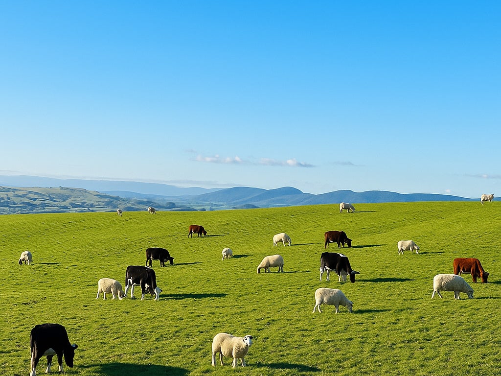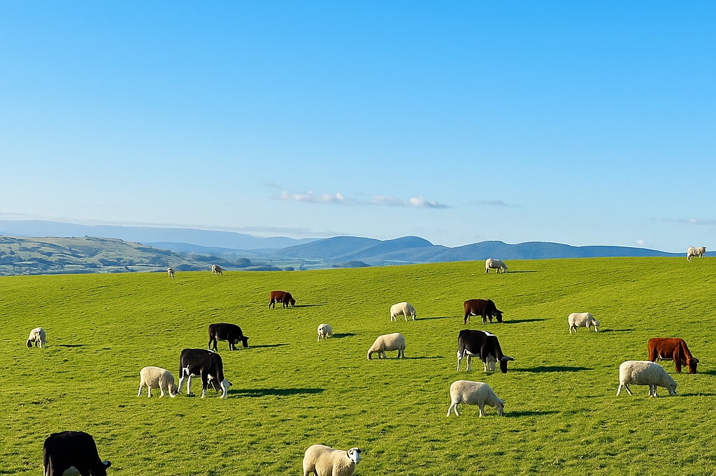 広大な牧草地でストレスフリーで育つグラスフェッド(牧草のみを食べて育つ)の羊、牛、鹿。ケージフリー(平飼い)で育つ鶏。栄養豊富で澄んだ海から獲れる魚介類。