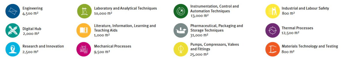 出展企業は次の12のグループに分類されます:エンジニアリング(4,500㎡)、研究室と分析技術(10,000㎡)、計装、制御、オートメーション技術(13,000㎡)、労働安全(800㎡)、デジタル・ハブ(2,000㎡)、文献、情報、学習・教材(1,000㎡)、製薬、包装、保管技術(31,000㎡)、熱プロセス(12,500㎡)、研究&イノベーション(2,500㎡)、メカニカル・プロセス(9,500㎡)、ポンプ、コンプレッサー、バルブ、継手(25,000㎡)、材料技術と試験(800㎡)