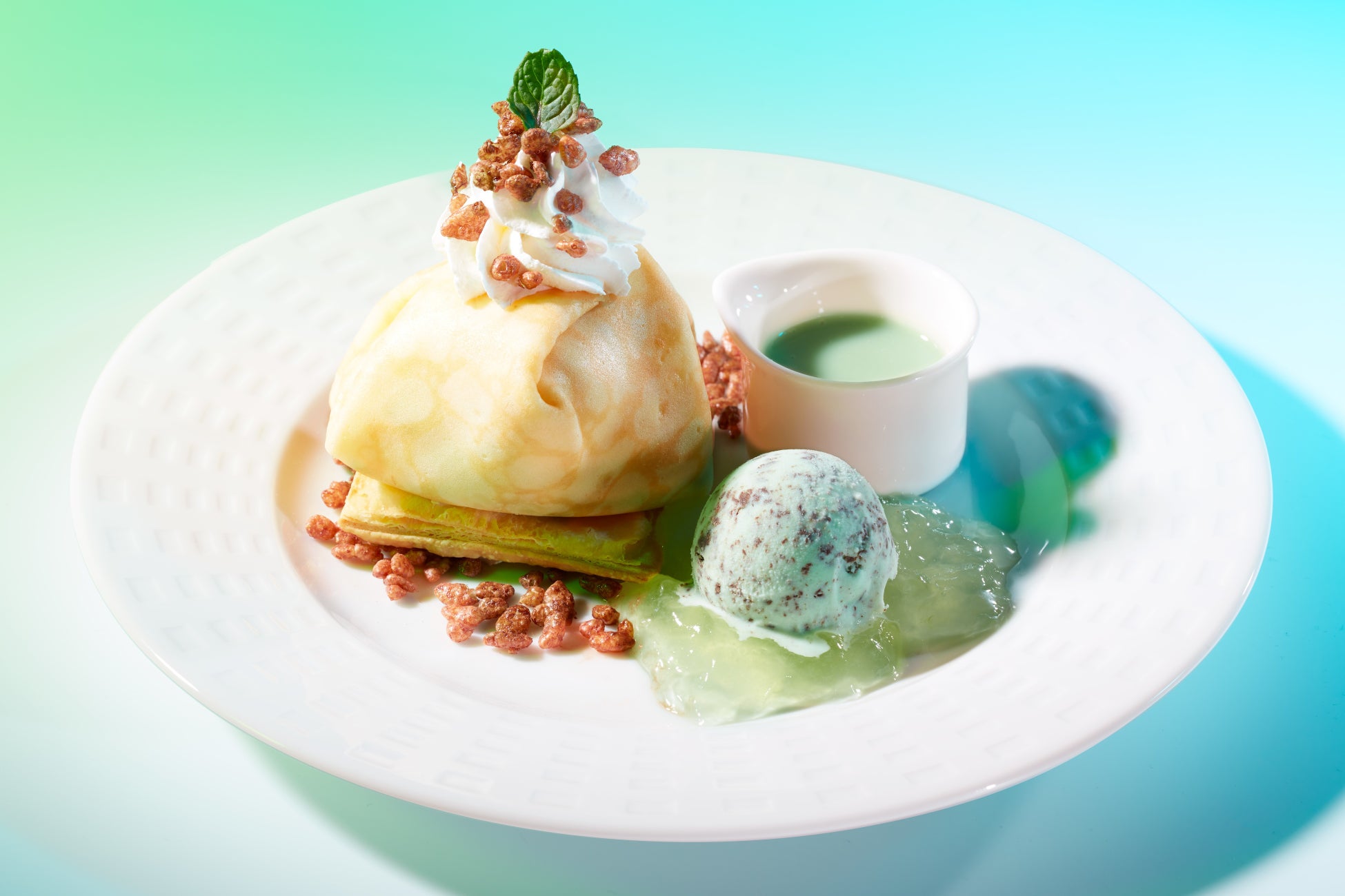 パイ生地にのったクレープの中には、ホワイトチョコを使用したなめらかなミントプリンがたっぷり入っています。濃厚な甘さのミントプリンに加えて、清涼感のあるチョコミントアイスとミントゼリーで様々なチョコミントを味わえます。別添えの追いミントソースで爽やかさをプラスするのもおすすめです。サクサクのパイ生地とザクザクのチョコクリスピーで食感もお楽しみください。