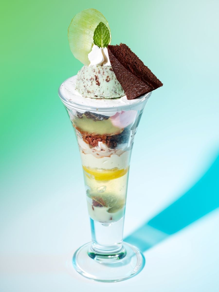「チョコミン党パフェ2022(ニゼロニニ)」は、 チョコミントアイス、チョコミントプリン、ミントゼリー、ミントホイップ、ミントソースを使用した、チョコミント尽くしの巨大パフェです。ガトーショコラとココアクッキーの濃厚なチョコの味わいと中層にあるレモンの風味が、爽やかなチョコミントを引き立てます。しっとりとしたガトーショコラ、サクサクのラズベリーメレンゲ、もちもちのマシュマロ、ザクザクのチョコクリスピーなど、食べ進めるごとに変化する食感もお楽しみください。上部にはゆずレモン風味の淡い黄色の飴細工をあしらい、爽やかな季節を演出しました。