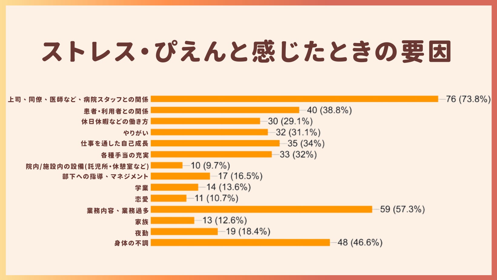 ストレス要因として最も多い回答は、「上司、同僚、医師など、病院スタッフとの関係」だった。次いで多い項目は、「業務内容、業務過多」「身体の不調」「患者・利用者との関係」だった。