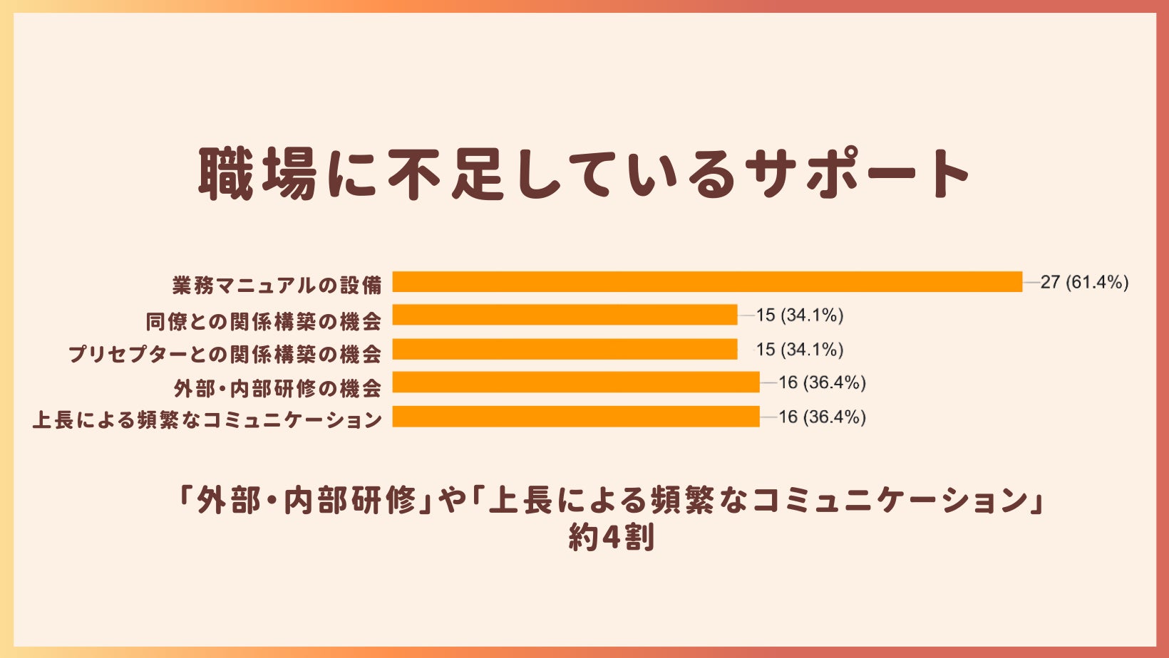 1〜3年目の看護師のみを対象にした調査では、「業務のマニュアル化」が61.4%と圧倒的に多い結果となった。また、「外部・内部研修」や「上長による頻繁なコミュニケーション」と答えた看護師は約4割を超えていた。
