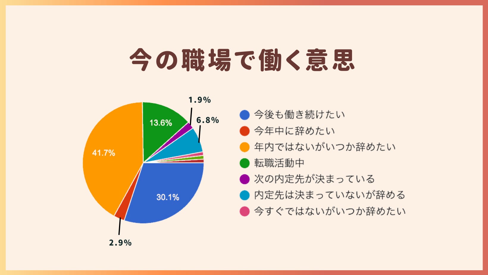 さらに、世界的な風潮としても、看護師の離職意向が高いことが指摘されています。ある調査によれば、仕事を続けたいと考える看護師は38.7%にとどまっています※2。弊社のユーザー調査でも、働き続けたい看護師が30.1%に留まり、同様の傾向が見られました。