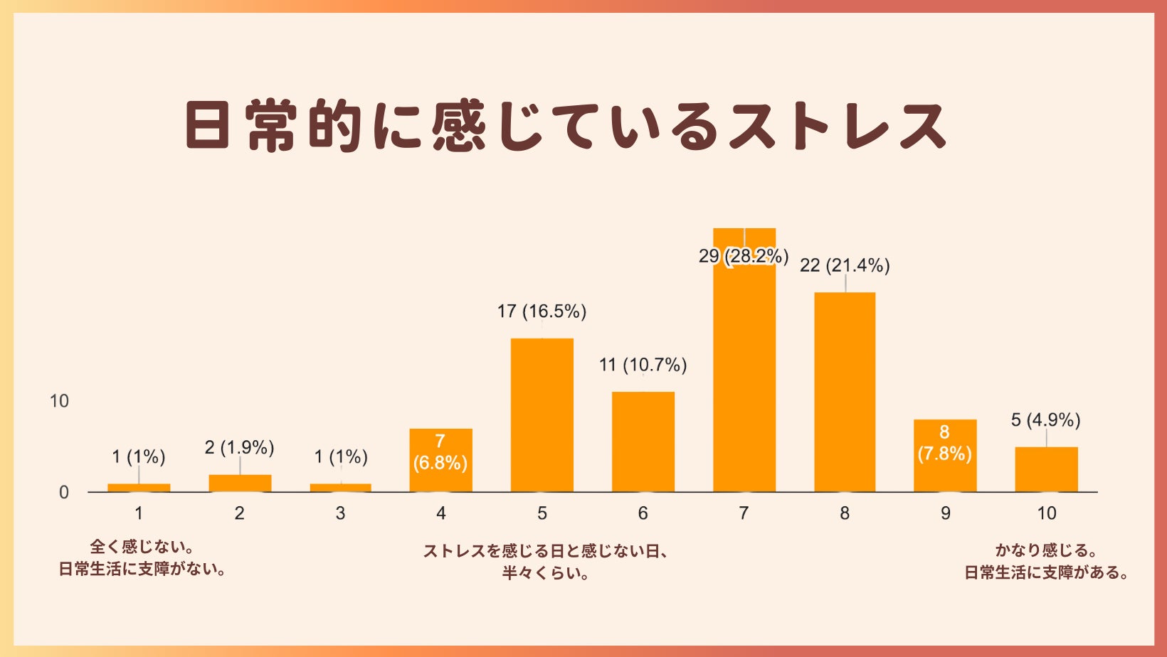 日常的にストレスを「全く感じない。日常生活に支障がない」を1、「ストレスを感じる日と感じない日、半々くらい」を5、「かなり感じる、日常生活に支障がある」を10とし、10段階で調査した。結果として、89.3%の看護師・看護学生が5以上と回答しており、5以下と回答した看護師・看護学生は僅か10.7%だった。中でも、7以上と回答した看護師・看護学生は62.3%に達し、多くの方が日常的にストレスを感じていることが示された。