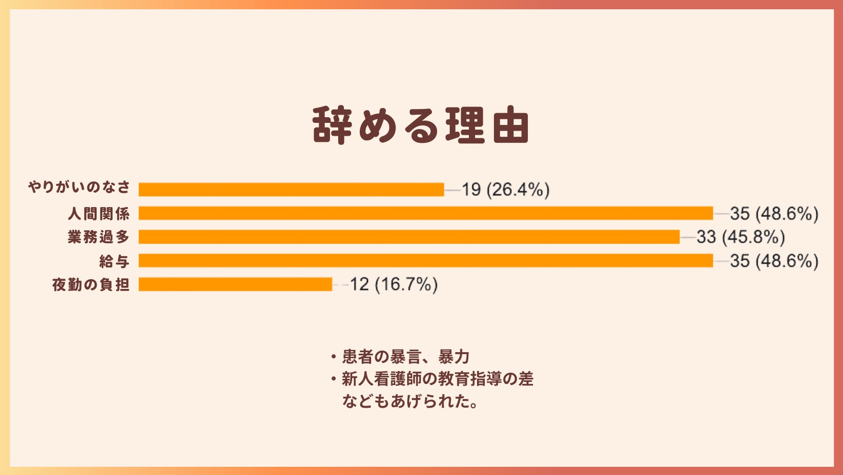 さらに、前向きな理由で、「今後も働き続けたい」と回答した看護師はわずか13.6%で、「人間関係」や「給与」を理由に、「辞めたい」と考えている看護師が8割を超えていることが明らかになった。