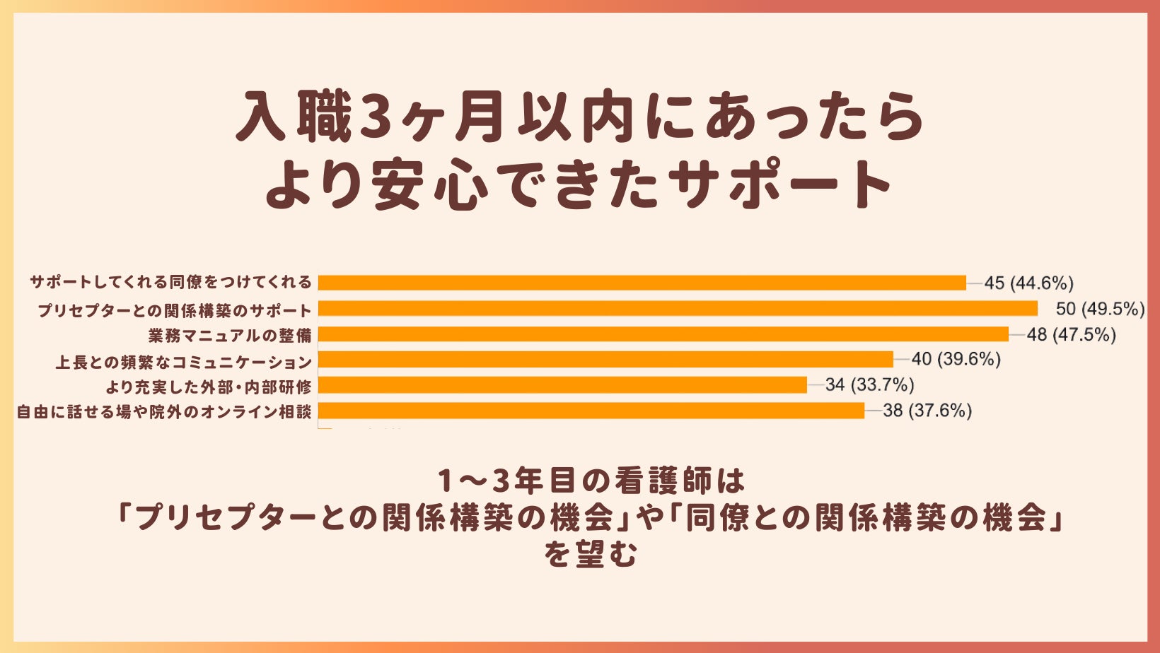 入職3ヶ月以内に職場からあったら、より安心できたサポートとして「プリセプターとの関係構築のサポート」が最多となった。次いで、「業務のマニュアル化」が多く挙げられた。また、1〜3年目の看護師は、「プリセプターとの関係構築の機会」や「同僚との関係構築の機会」を望む回答が最も多かった。