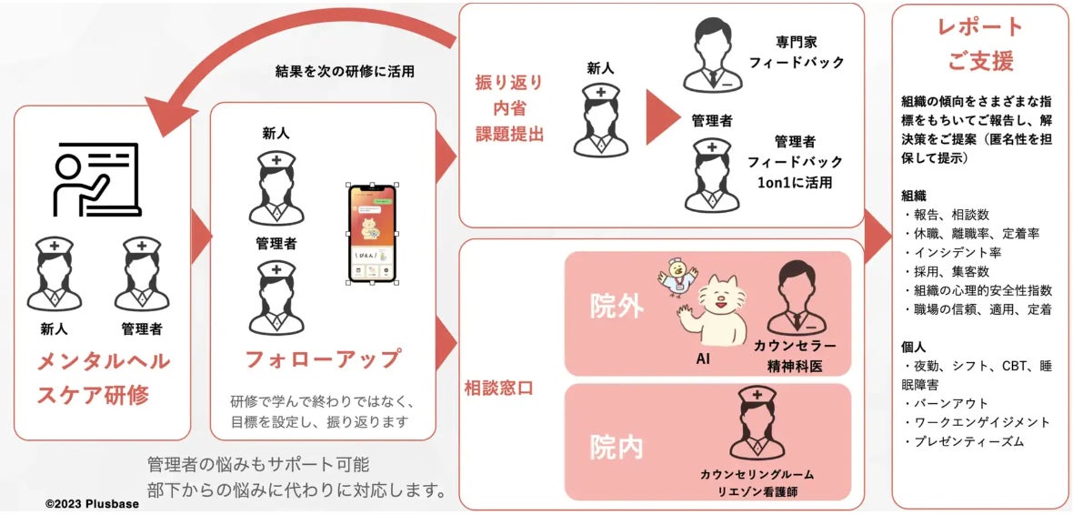 株式会社Plusbaseは、「働く人のこころを守る」をミッションに掲げ、急性期病棟の看護師の54%が抑うつ症状を抱えながら働いている現状※1に着目し、AIを使った看護師特化のメンタルヘルスケアアプリ「ナースビー」を提供しています。今まで、精神病院や介護施設などを有する医療法人原会と顧問医師監修のもと、1800人近くの看護師のメンタルヘルスケアに「個人向けアプリ」として向き合ってきました。