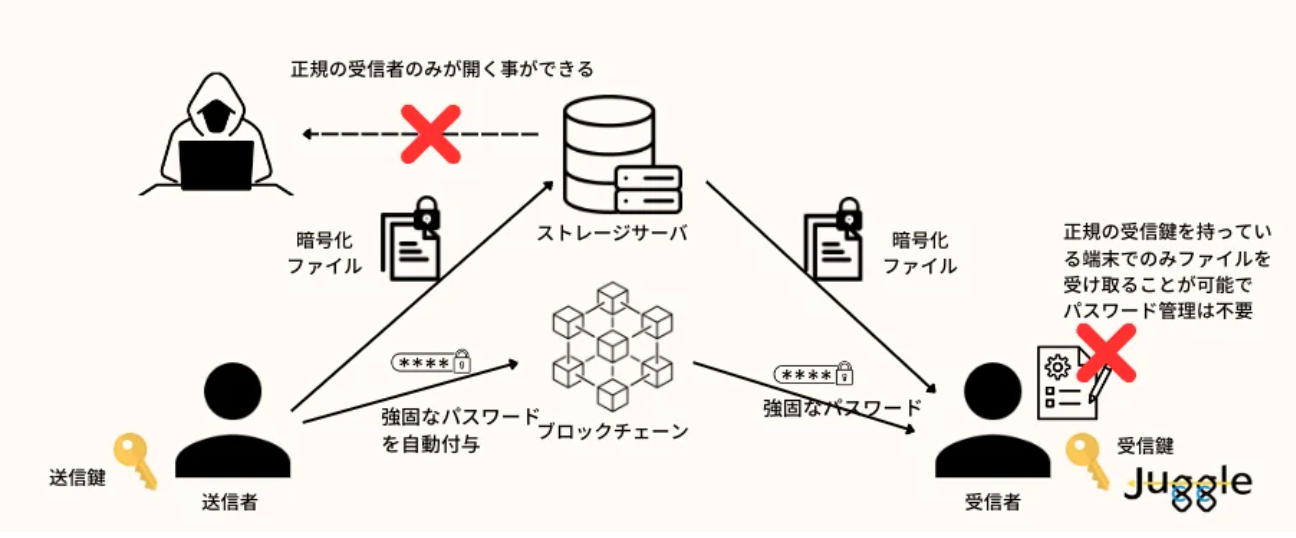 ファイルセキュリティシステム「JUGGLE」はアップロードするファイルに対し、安全性の高いパスワードを自動で生成し、ブロックチェーン技術と暗号化技術を統合し、秘匿性の高いファイル共有と快適な操作環境を実現します。