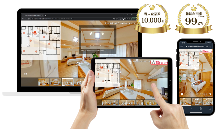 「THETA 360.biz(シータ サンロクマル ドットビズ)」は、360度カメラ RICOH THETA(リコー シータ)で撮影した360度画像を使って、誰でも簡単に360度VRコンテンツを作成し、その場にいるかのような臨場感で物件の案内や確認ができるクラウドサービスです。ポータルサイトへの掲載だけでなく、自社ホームページへの掲載やチラシへのQRコード貼り付け、メールでの共有など、いつでもオンラインでの内見が可能となります。