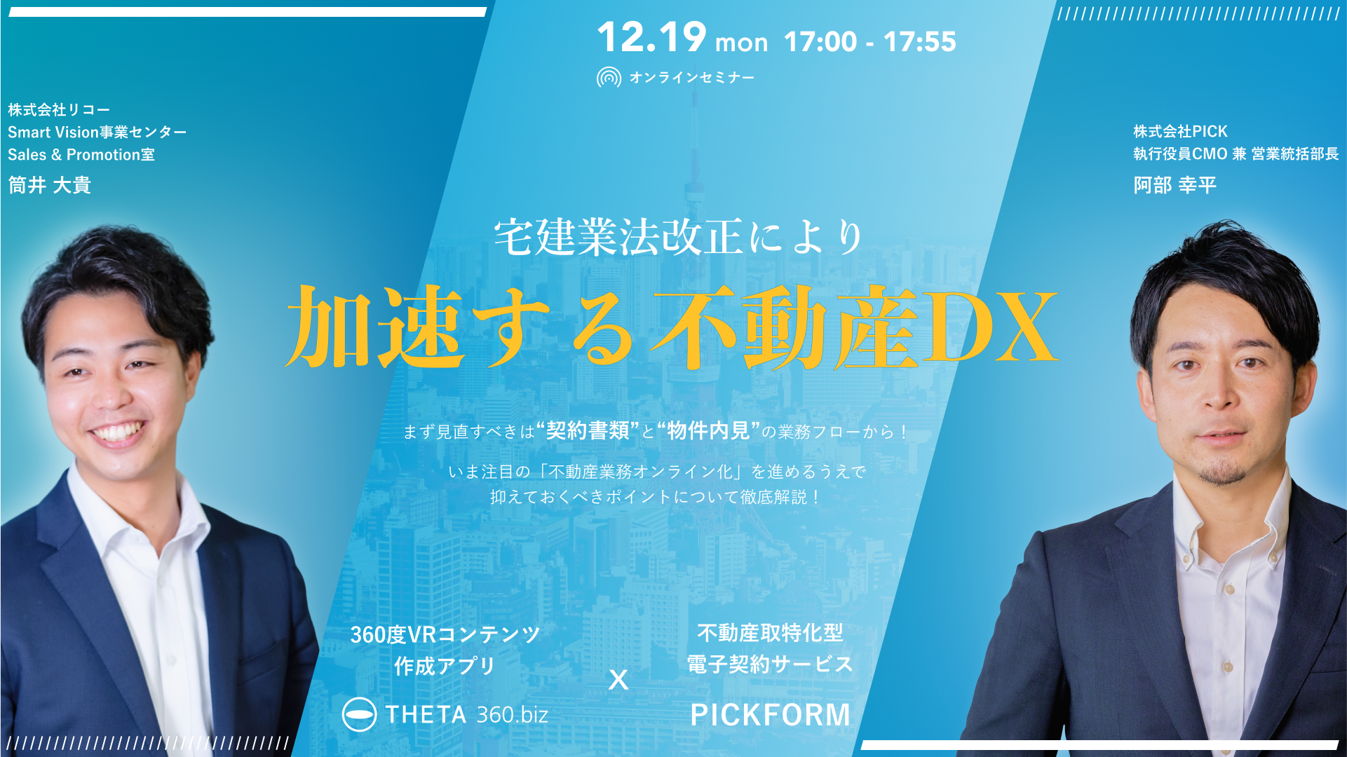 今回は、不動産取引に特化した電子契約ツール「PICKFORM」を提供する株式会社PICKと、10,000社以上が利用する360度VRコンテンツ作成アプリ「THETA 360.biz」を開発・提供している株式会社リコーによる共催セミナーとなります