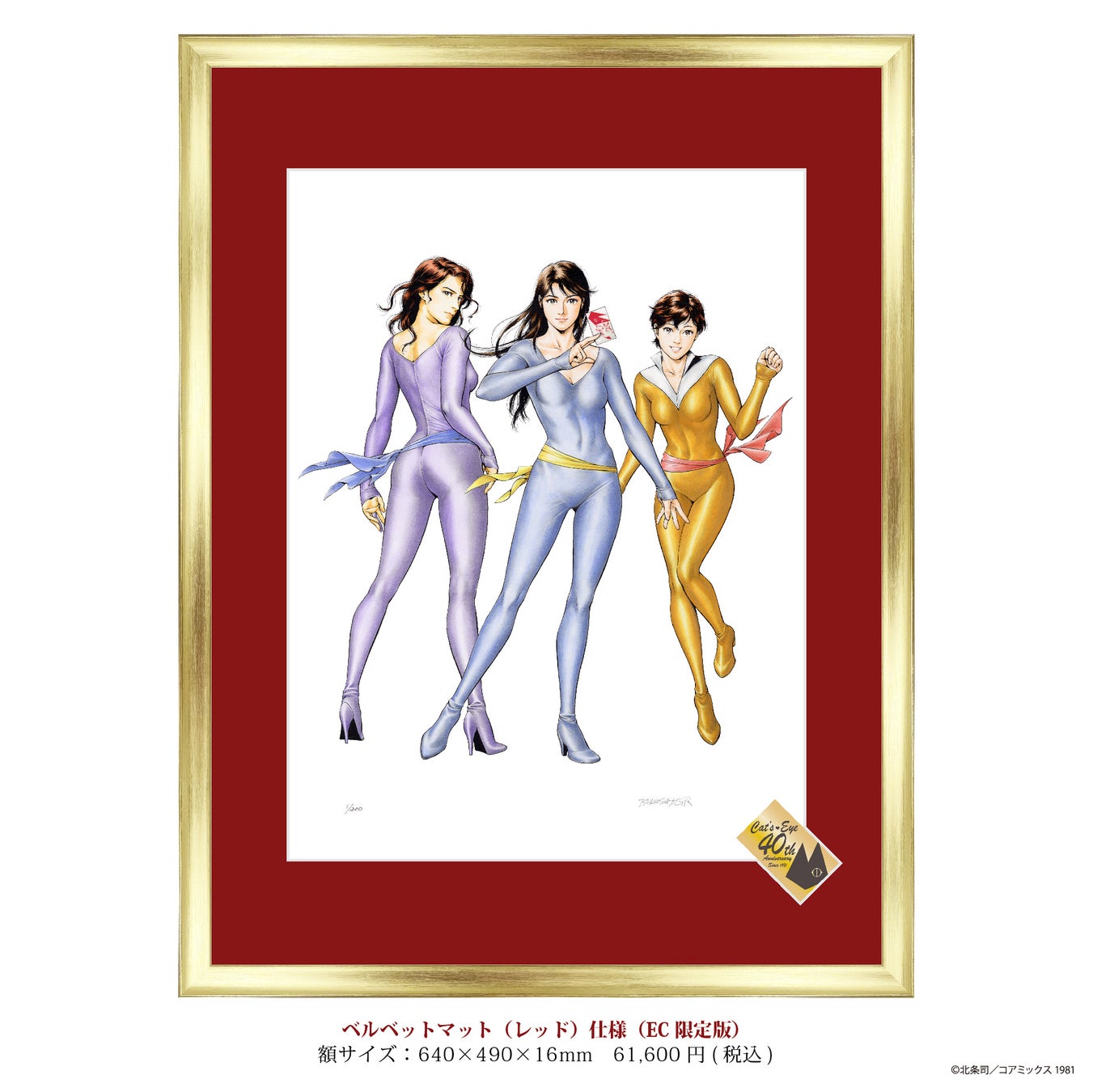 もうひとつの新作版画は北条司ILLUSTRATIONS1991年ポスター裏面からの三姉妹のイラストから。赤いラインが美しいダブルマット仕様のものは会場限定版となります。