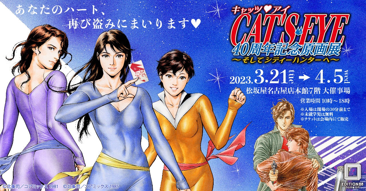 株式会社VISION8(EDITION88アートギャラリー)は、2023年3月21日(火・祝)~4月5日(水)の期間、「キャッツ♥アイ40周年記念原画展 〜そしてシティーハンターへ〜」を、愛知県名古屋市(松坂屋名古屋店 本館7階 大催事場)にて開催いたします。