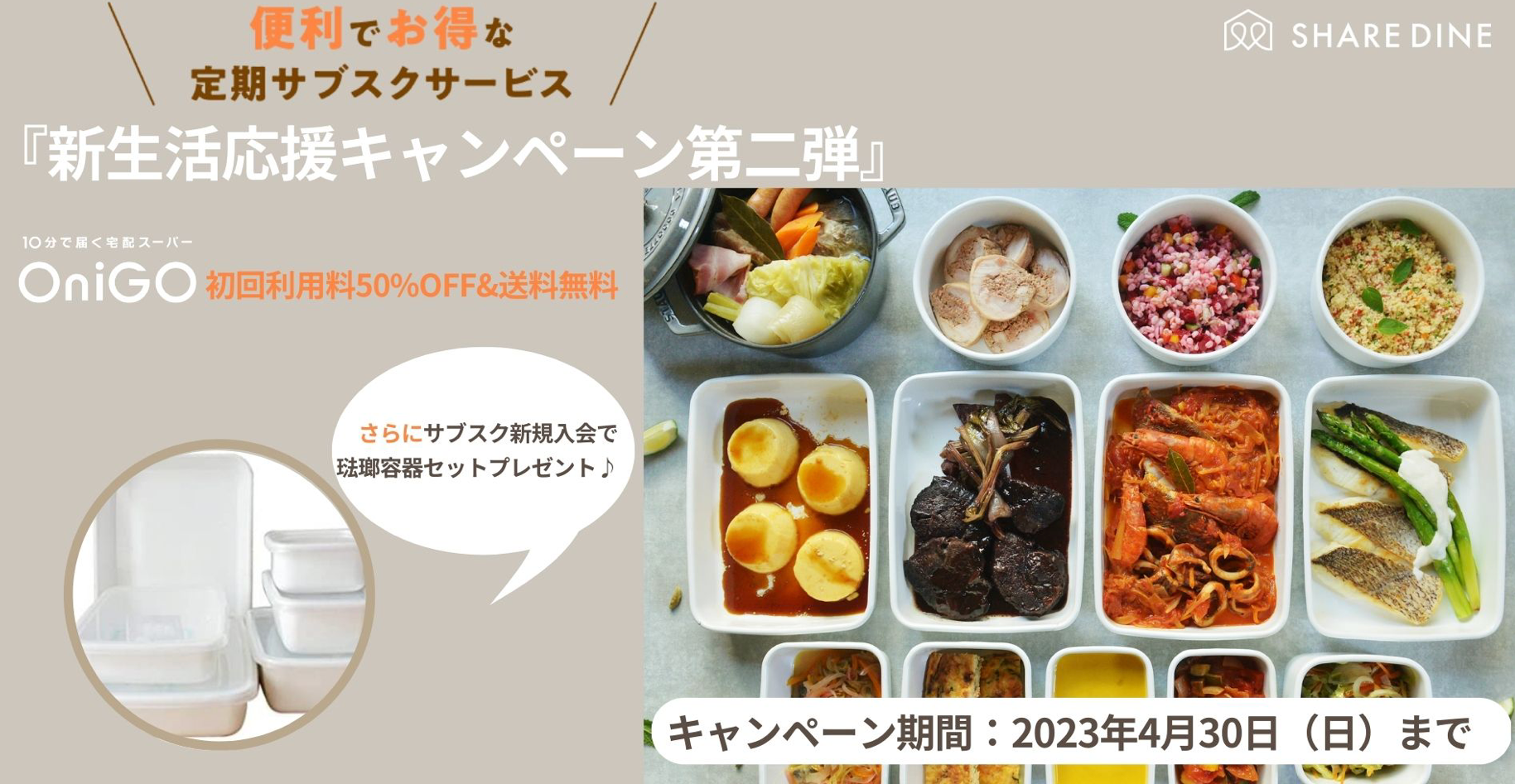 今回、コラボを実施するシェアダインでは「新生活応援キャンペーン第二弾」を開始し、食卓を共創するパートナーとして、4月からの職場復帰やお子様の小学校入学など新しい環境での両立に向けて準備する世帯を食卓から応援します。期間中に新規でシェアダインの定期サブスクにお申し込みいただいた方に「琺瑯容器3点セット」(5,500円相当)をプレゼントされ、OniGOからは、定額サブスクご利用中に限り、初回OniGO利用料50%OFF(利用上限1,500円)& 送料無料 の特典が付きます。