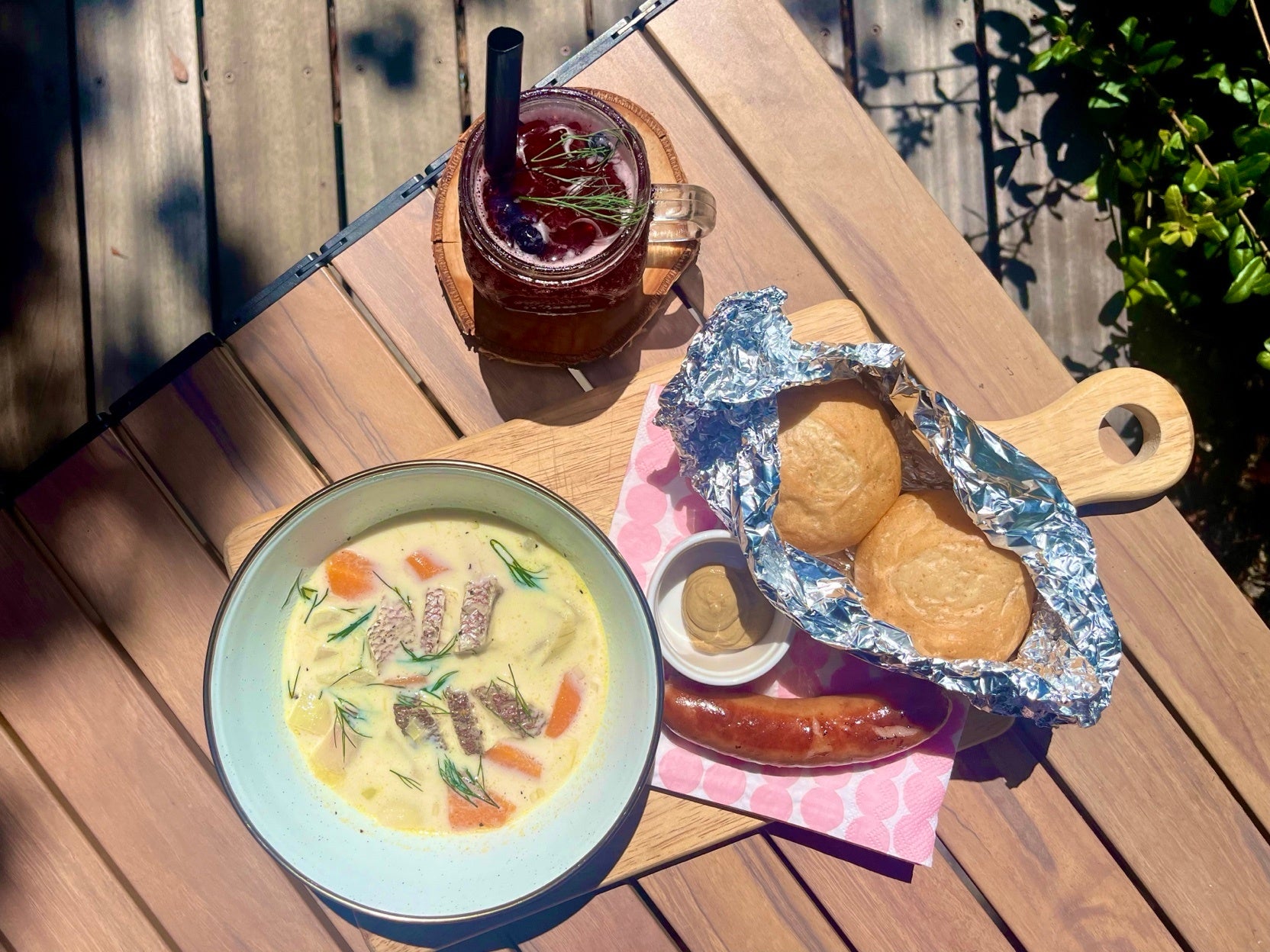今回のイベントに合わせて、飲み物はブルーベリージュースを、軽食(サ飯)にはフィンランドとグランピングをイメージした軽食をご用意しています。