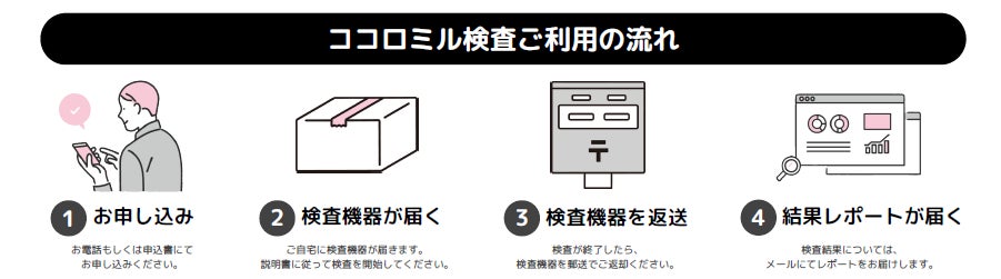 当社が提供するココロミル検査は、ウェアラブルな小型心電計を用いたもので、自宅で誰でも簡単に心電図を計測することができます。