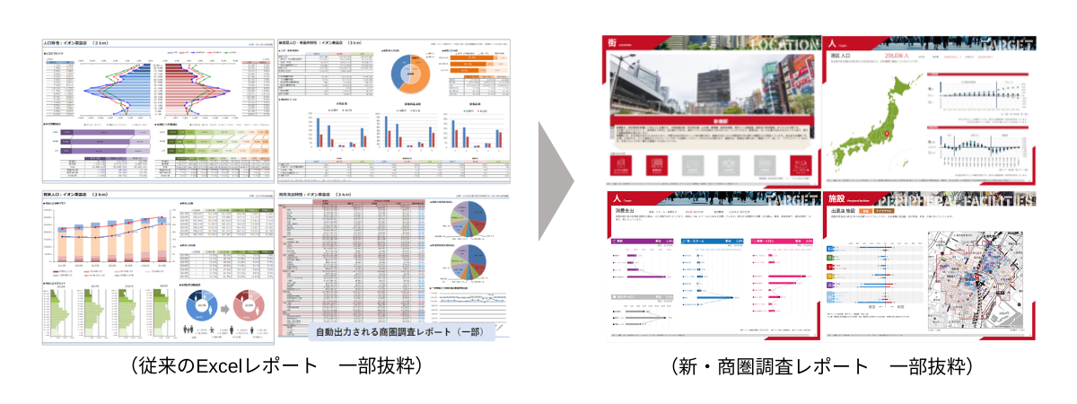 当社エリアマーケティング分析ツールには、従来より国勢調査や商業統計、消費支出、世帯/個人年収等、各種統計データをグラフや表にまとめた商圏レポートを自動出力し、自在に加工・編集できる「Excelレポート出力機能」を有しており、小売・流通・不動産・ディベロッパー・外食等の店舗の出店・販促戦略・経営戦略立案等に活用されております。