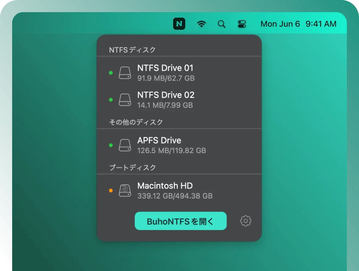 日常的なNTFS簡単などの操作がシームレスに行えるように、BuhoNTFSメニューを設計しました。この機能により、Macのメニューバーでは、マウントされたNTFSドライバを直感的に、かつ効率的に管理でき、使い勝手も大幅に向上させます。