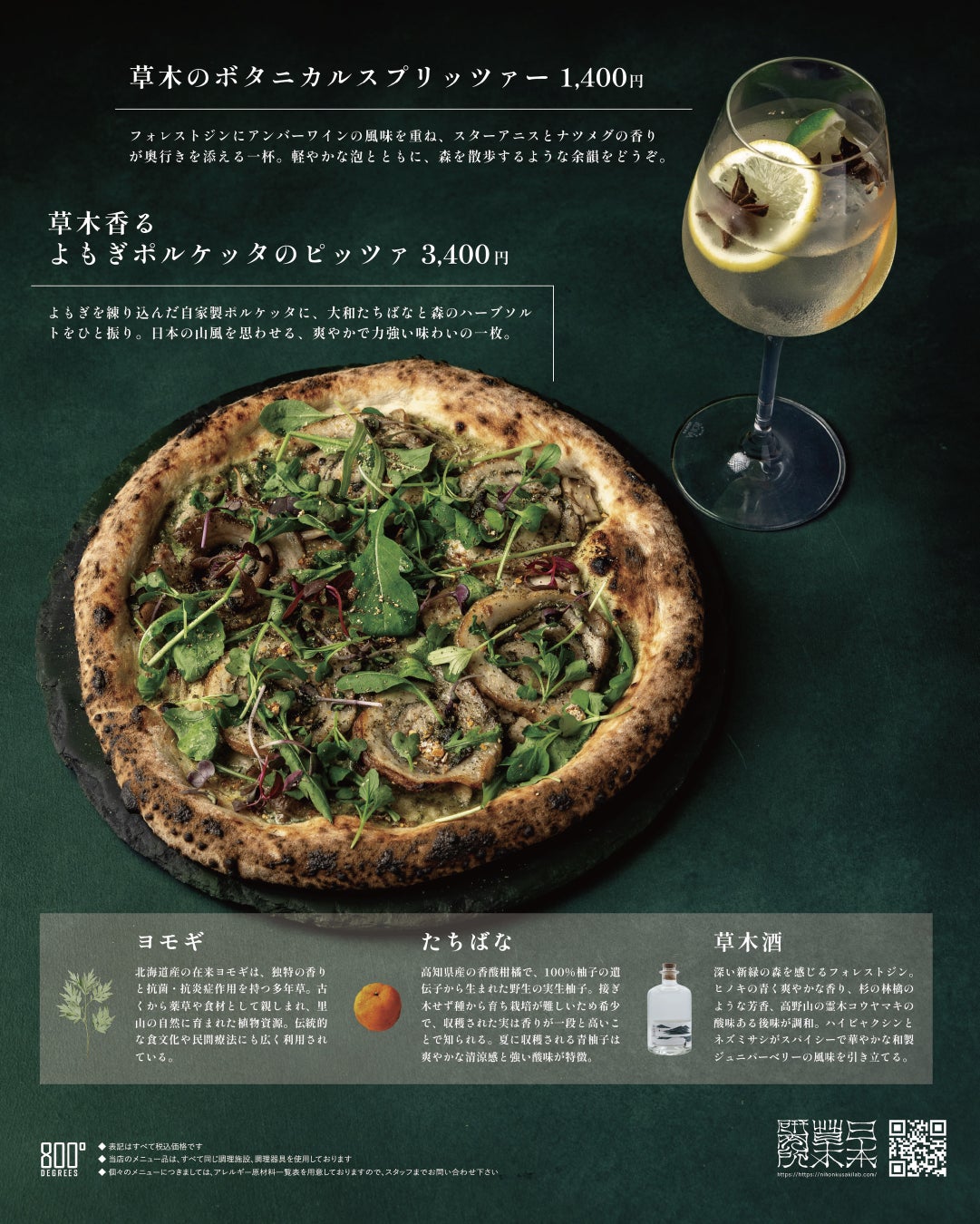 よもぎを練り込んだ自家製ポルケッタに、大和たちばなと森のハーブソルトをひと振り。日本 の山風を思わせる、爽やかで力強い味わいの一枚です。※ディナータイム限定