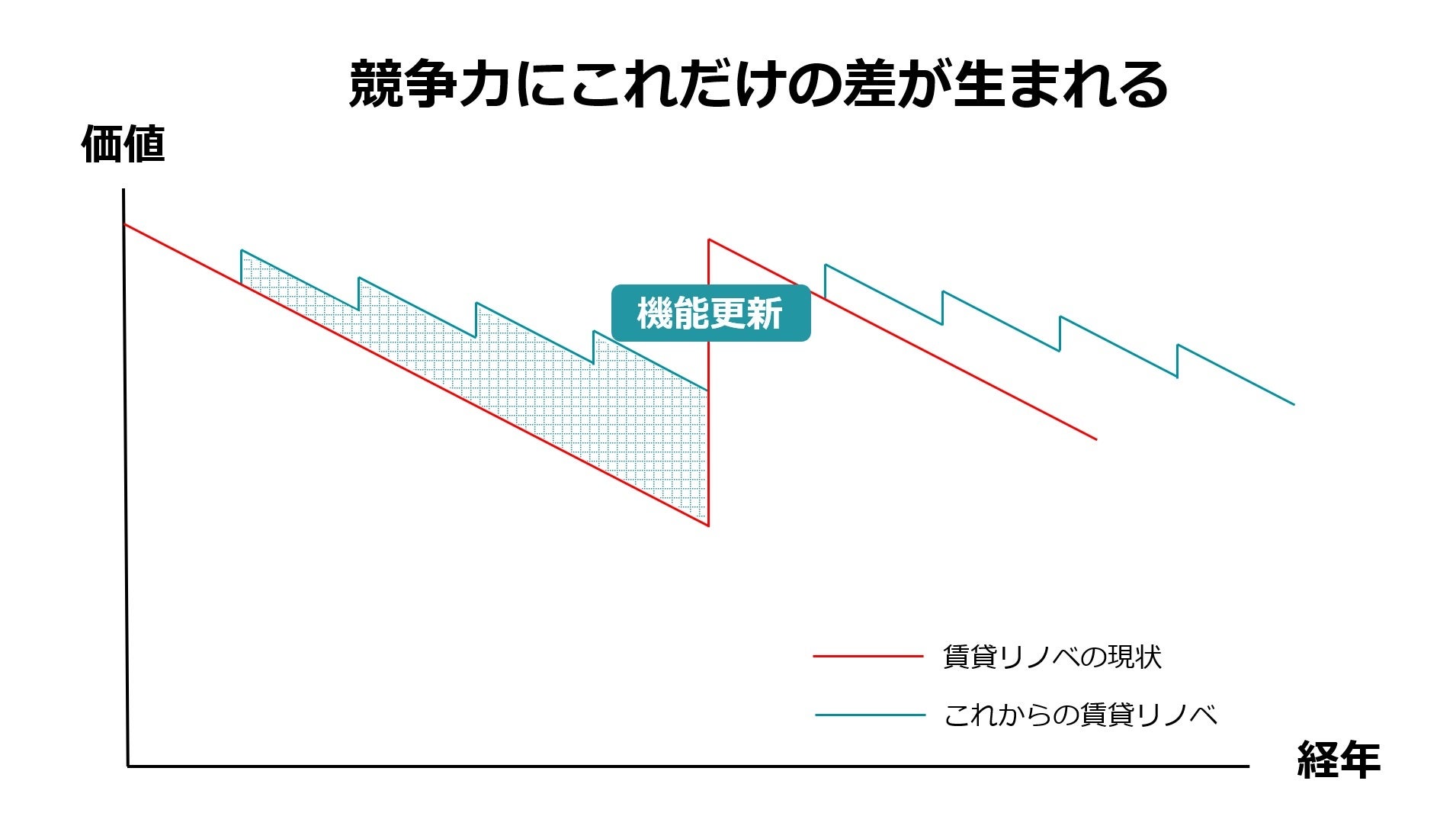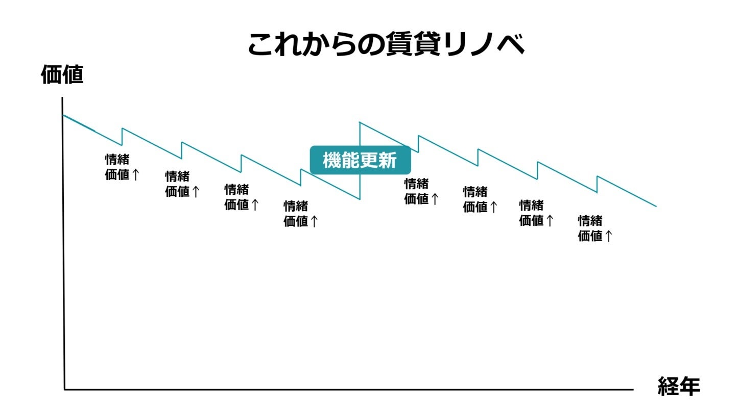 これからの賃貸リノベは築後30年前後の機能更新まで、5〜6年周期で情緒的価値の更新をすることで競争力を維持することが必要です。