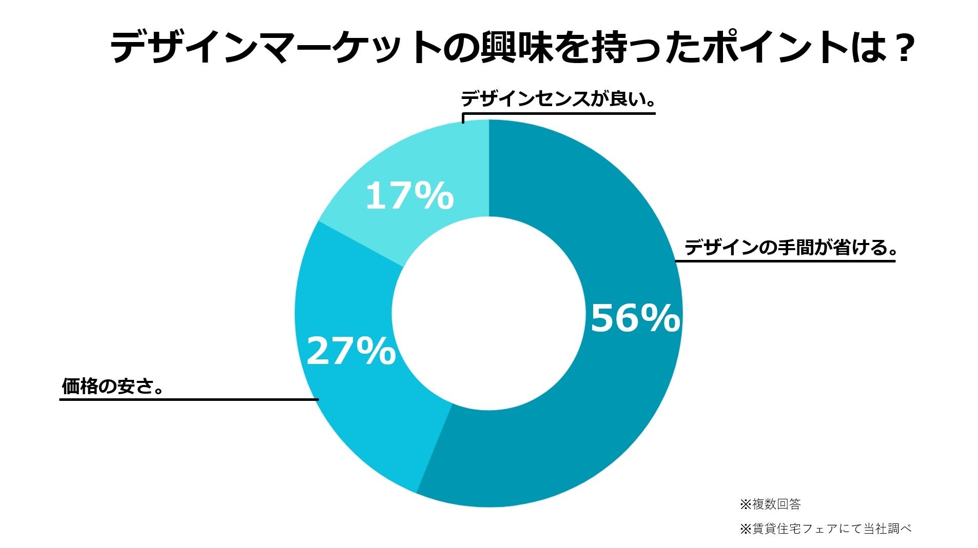 365Design Marketのサービスを導入したいまたは興味があると答えた来場者にその理由を聞いたところ、複数回答による調査では、デザイン業務の手間が省けるが56%、価格の安さが27%、デザインセンスの良さが17%という結果となりました。